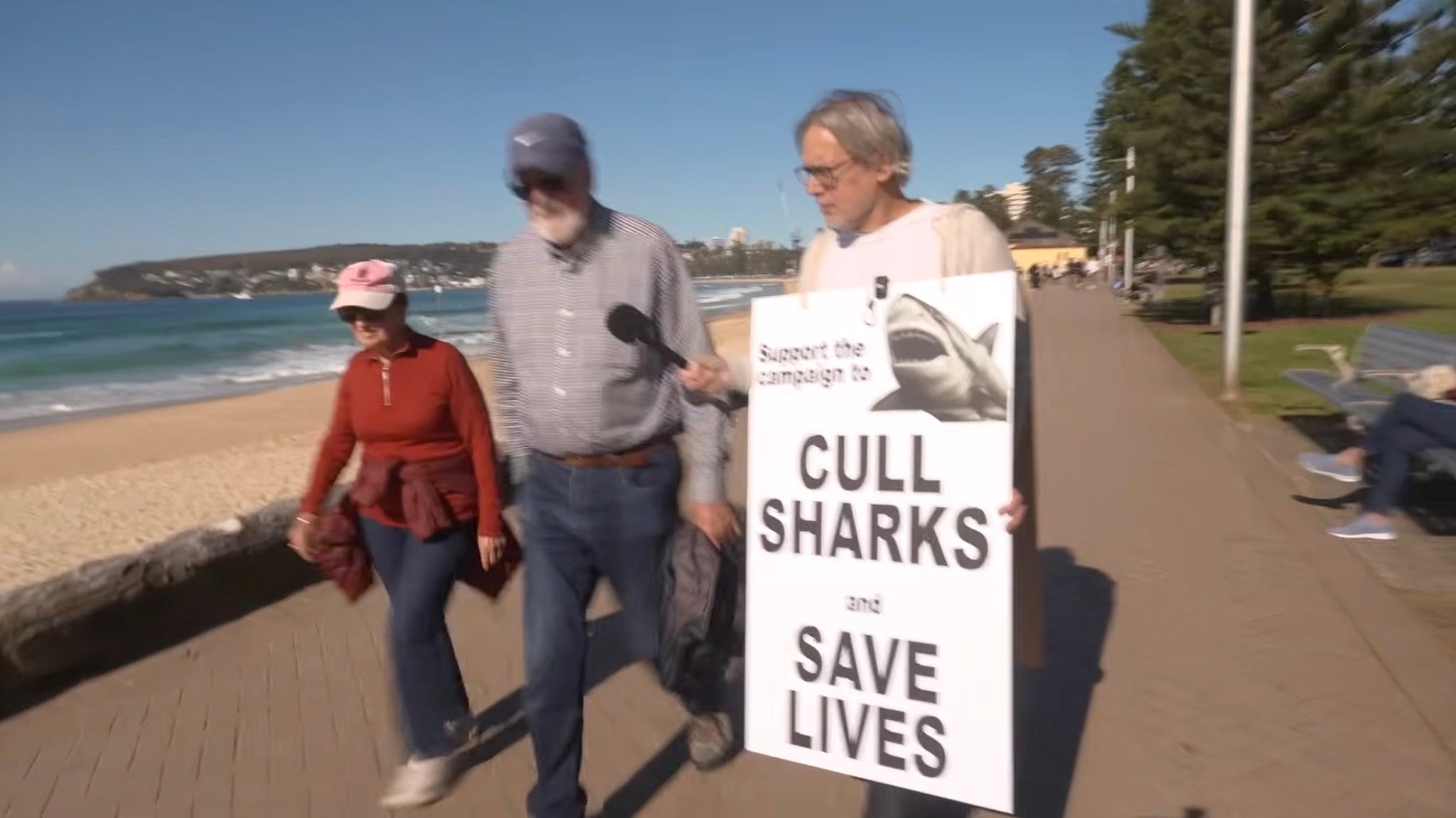 I recommend you watch it if only for the scene at the start where I stroll along the promenade at Manly Beach, Sydney, wearing a sandwich board asking people to “Support the campaign to cull sharks and save lives”.